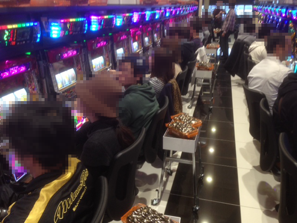 13時を過ぎるとホール全体の活気がさらに上がっており、4円パチンコでは「CR燃える闘魂アントニオ猪木〜格闘技世界一決定戦〜」や「CR真・花の慶次」、「ぱちんこCR北斗の拳6 拳王」といったMAXタイプの人気機種には空き台はほぼ見られない。嬉しそうに遊技するプレイヤーも多数おり、満足度も高そうだ。