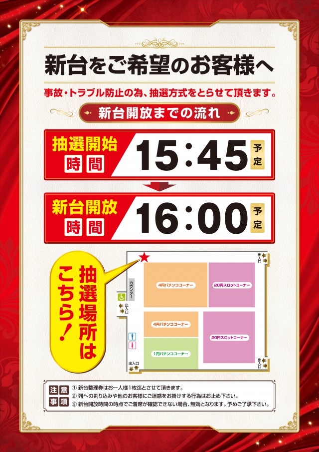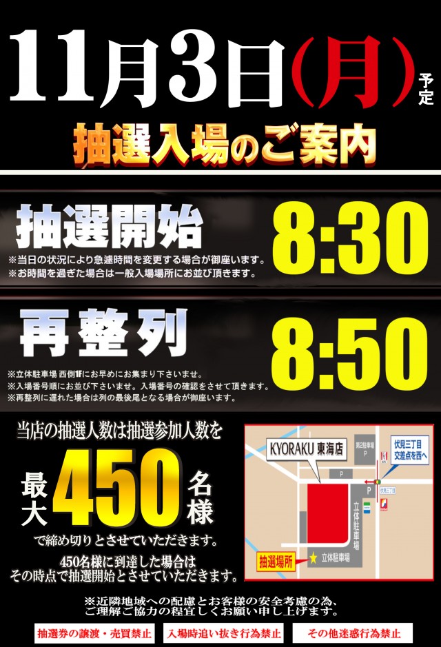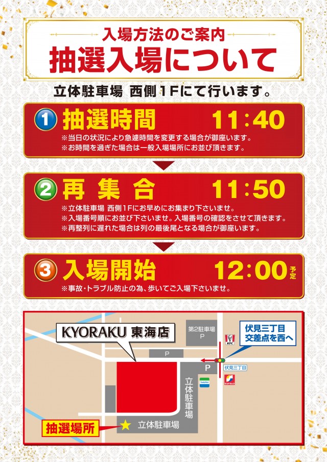 8:40~抽選開始 8:50再集合 ※抽選開始時間前までにお並び下さい。また、再集合時間を過ぎての集合は、抽選入場最後尾の入場となります。 |