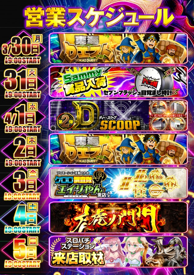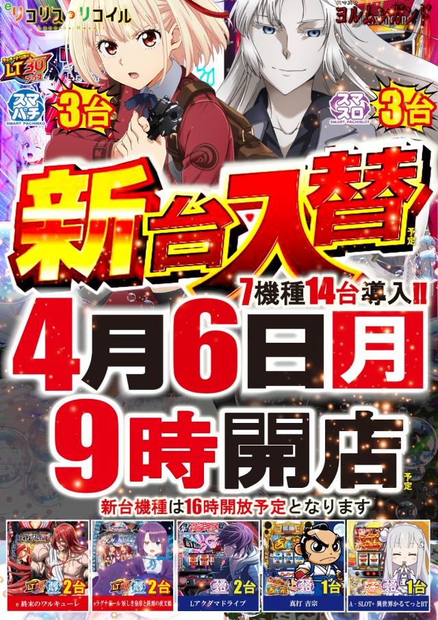 4月6日(月)新台入替朝9時OPEN!(予定)