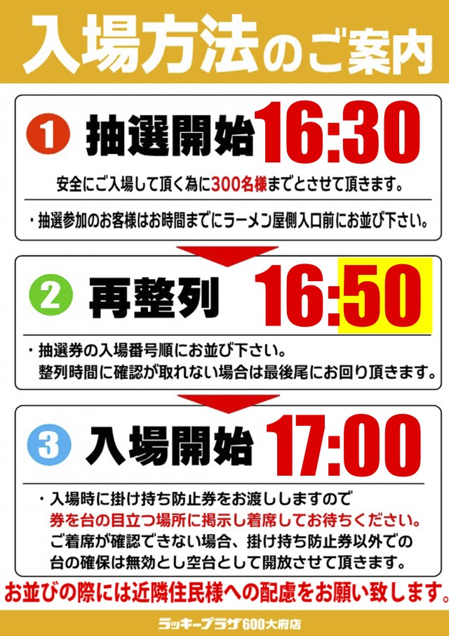 8:30抽選開始 8:50再集合 9:00入場開始 ※入場時に掛け持ち防止券をお渡しするので、入場されたお客様は券を遊技台に置いて、そのまま遊技台でお待ちください。 |