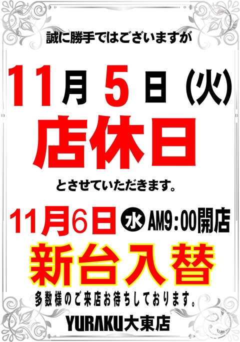 有楽大東店情報 11月5日(火)は店休日です。