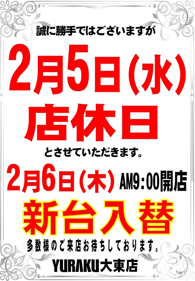 有楽大東店情報 2月5日(水)は店休日です。