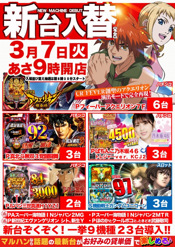 7日「火」!新台入替!愛知・岐阜マルハン全店!朝9時開店😆