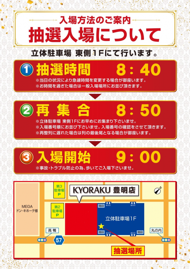 8:40までにお集まりの方を対象に抽選開始。※店舗の都合により、急遽時間を変更する可能性がございます。 |
