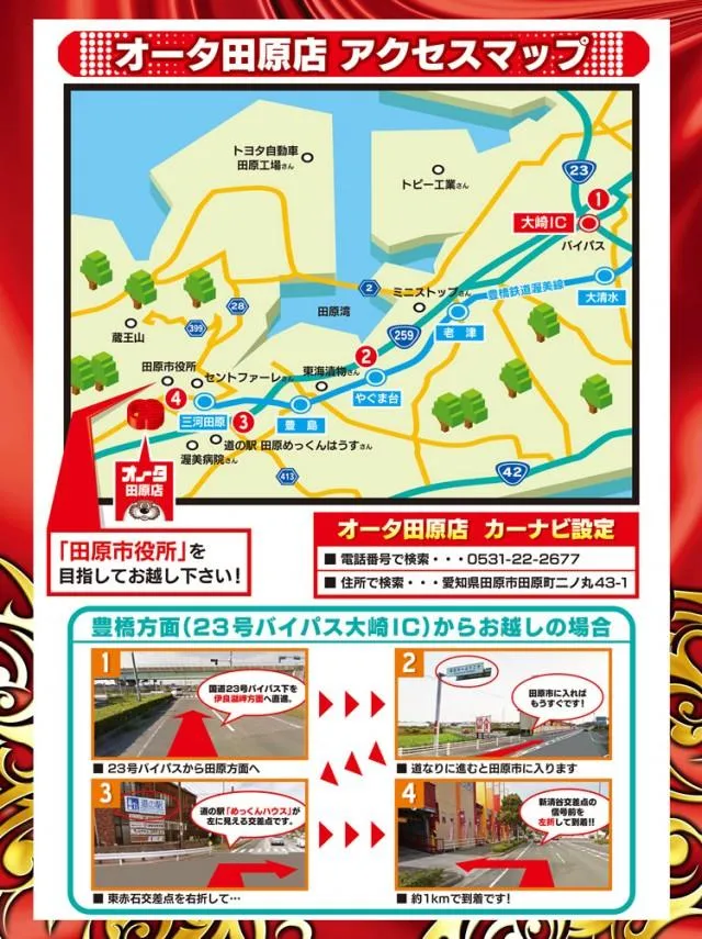 豊橋鉄道三河田原駅下車徒歩5分、田原郵便局そば |