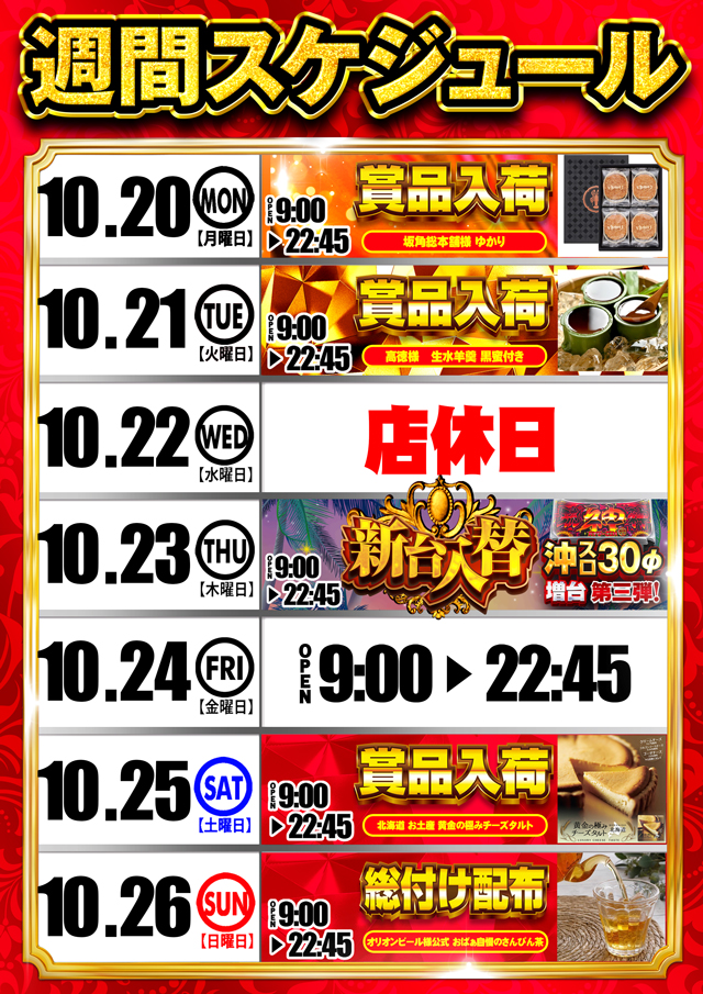10月23日【木】☆新台入替☆あさ9時オープン!!