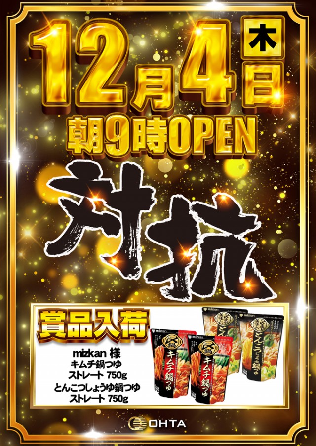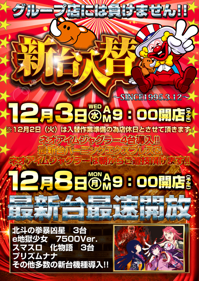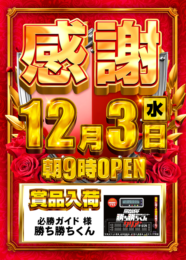12月3日(水)☆新台入替&賞品入荷☆あさ9時オープン!!