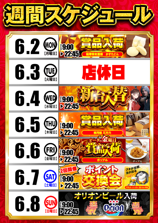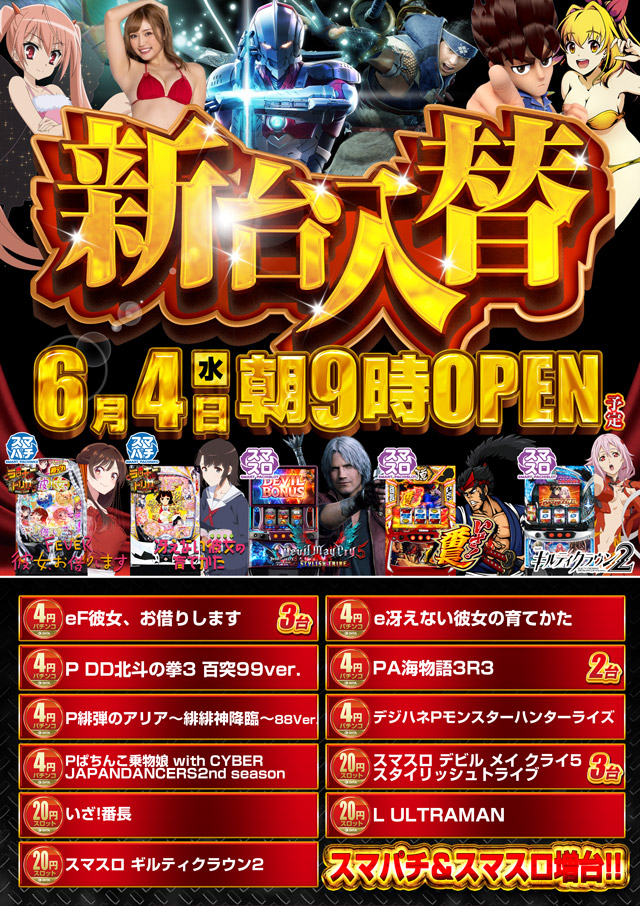6月4日(水)☆新台入替☆あさ9時オープン!!