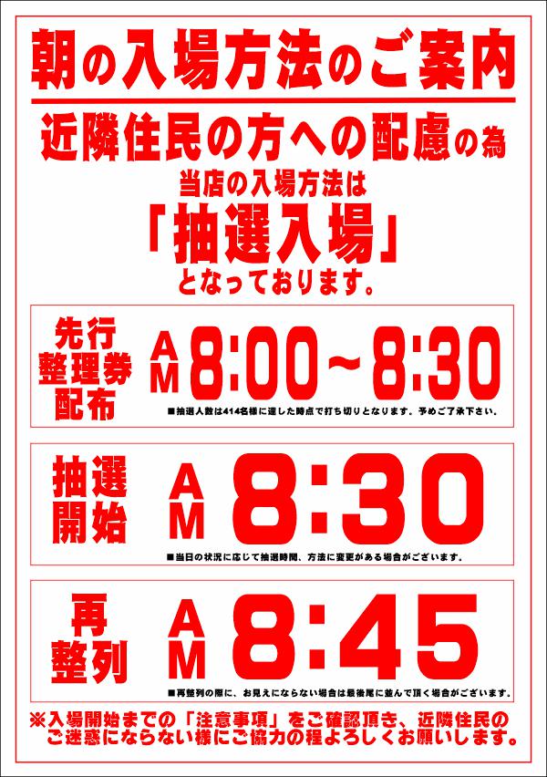 朝8:20より整理券を配布致します。※開店時間変更時は店舗にて案内をご確認ください |