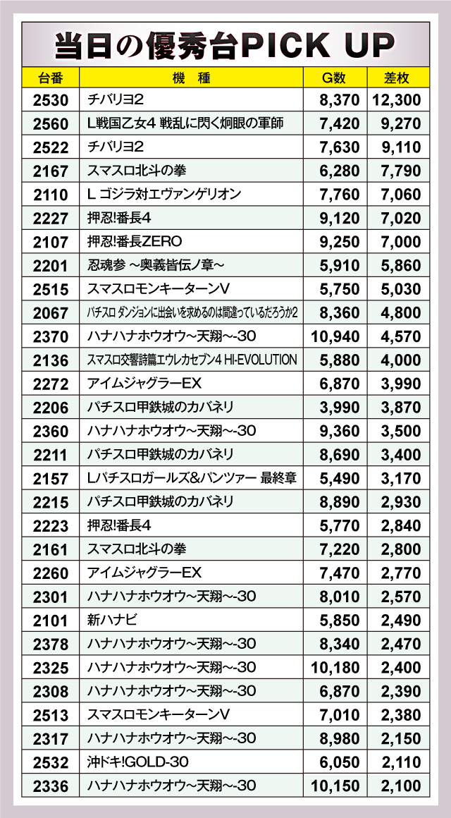 まずは、差枚トップ30台のランキングからご紹介。この日の差枚トップとなったのは、2530番台の『チバリヨ2』。+12,300枚と大台を超える記録に到達。なお『チバリヨ2』は3位にもランクインしており、各地で驚きの記録を出している人気機種がその実力を十分に発揮していた。それに続くのが2560番台の『L戦国乙女4 戦乱に閃く炯眼の軍師』。こちらも+9,270枚と、大台まであと一歩のところまで迫る勢いの強さを見せてくれた。