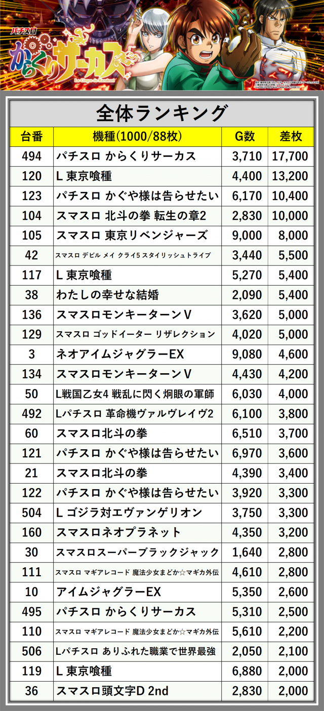 厳選された取材対象機種をはじめ、その他スロット全体から好記録が飛び出した!プレイヤーが楽しんだ1日を下記データにて振り返ってみて欲しい。