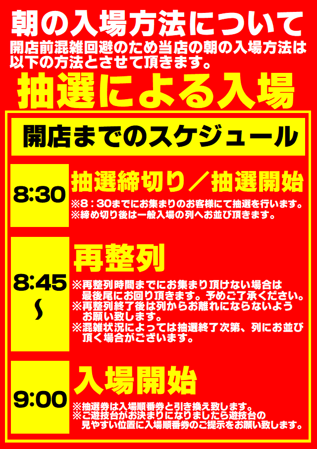 朝8:30までにお集まりのお客様を対象に抽選入場とさせて頂きます。※8:30以降にお越しのお客様は一般入場とさせて頂きます。 |