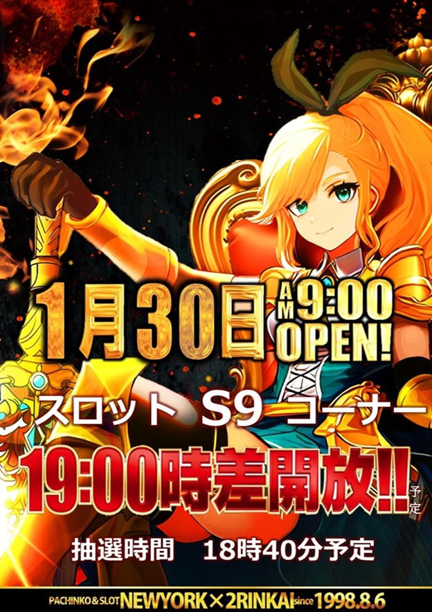 本日スロットS9コーナー時差開放⏰抽選は18:40開始頃予定