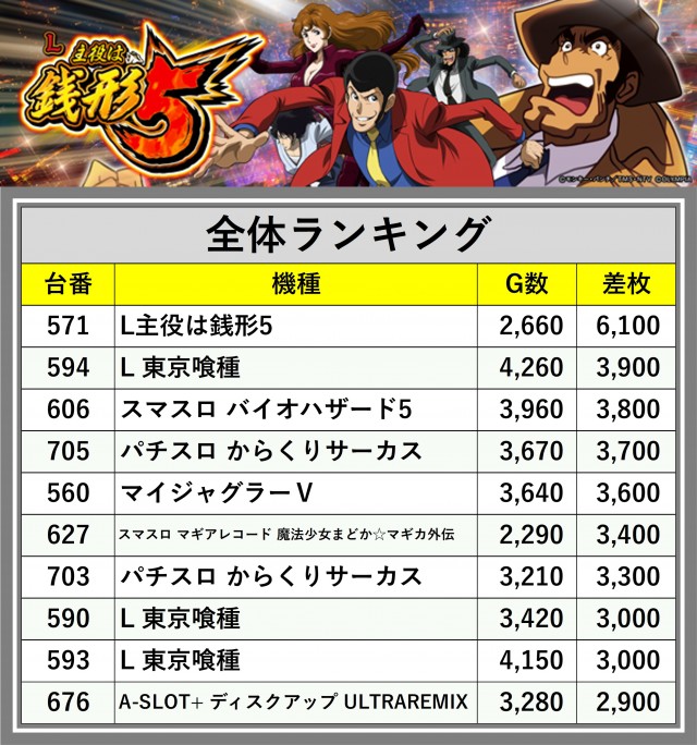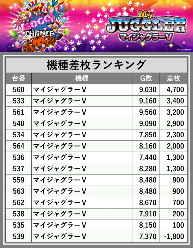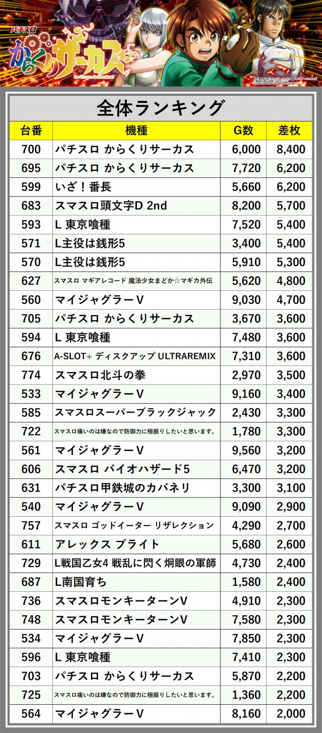 ※差枚数順に掲載しています