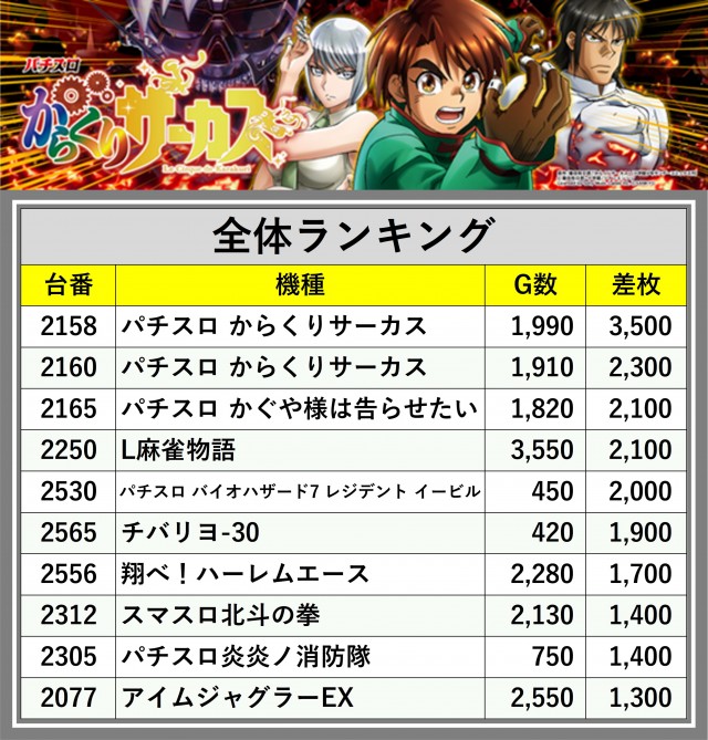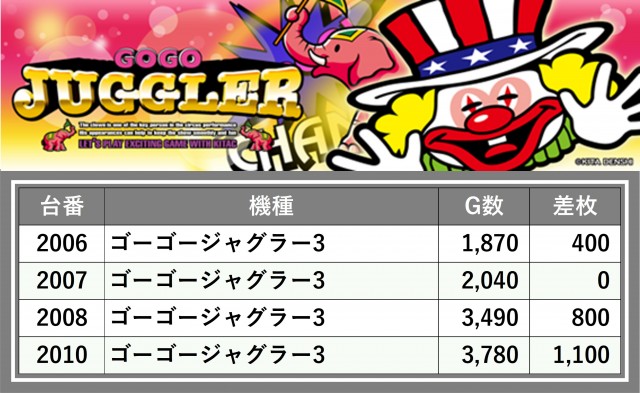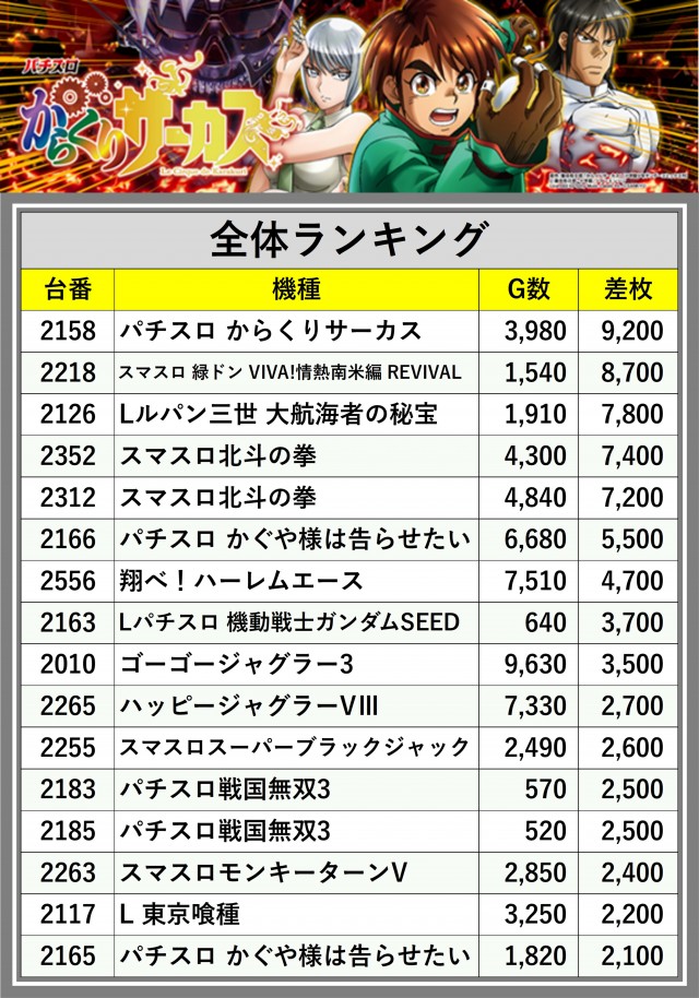 厳選された取材対象機種をはじめ、その他スロット全体から好記録が飛び出した!プレイヤーが楽しんだ1日を下記データにて振り返ってみて欲しい。