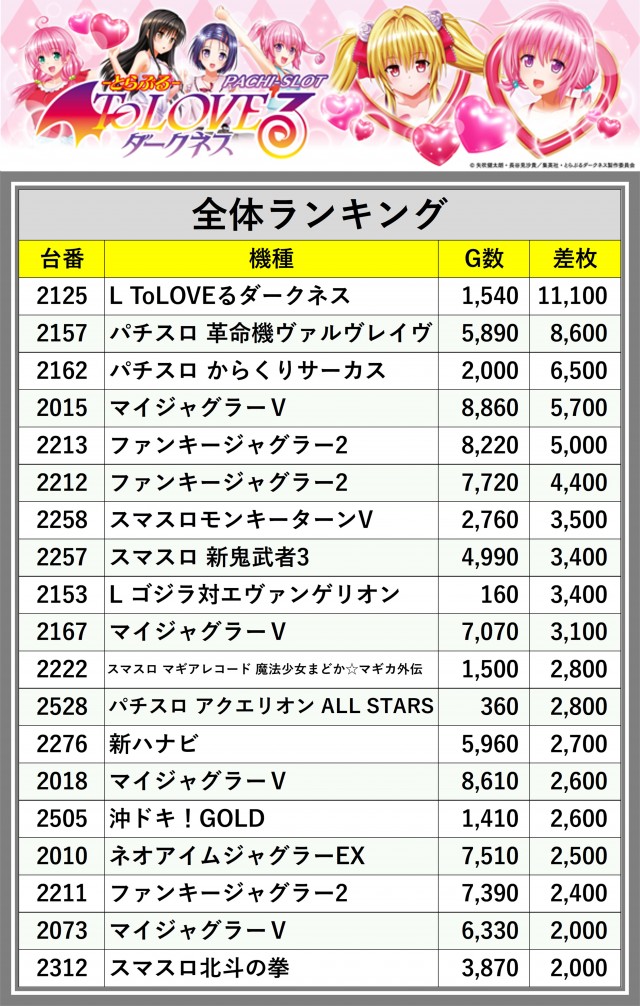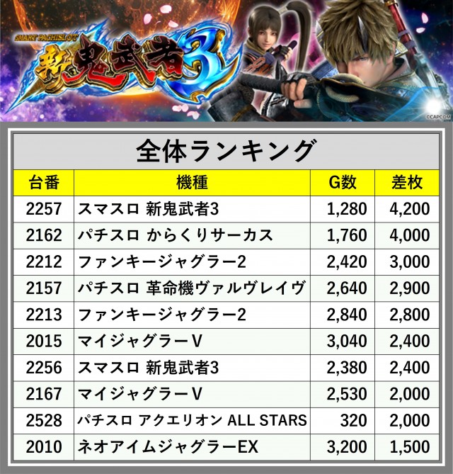 ※差枚数順に掲載しています