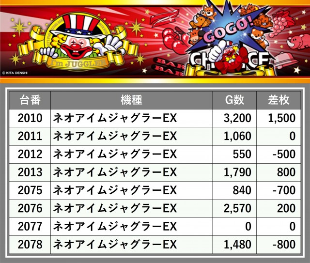 厳選された取材対象機種をはじめ、その他スロット全体から好記録が飛び出した!プレイヤーが楽しんだ1日を下記データにて振り返ってみて欲しい。