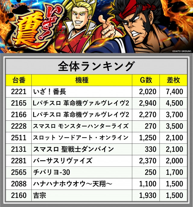 厳選された取材対象機種をはじめ、その他スロット全体から好記録が飛び出した!プレイヤーが楽しんだ1日を下記データにて振り返ってみて欲しい。