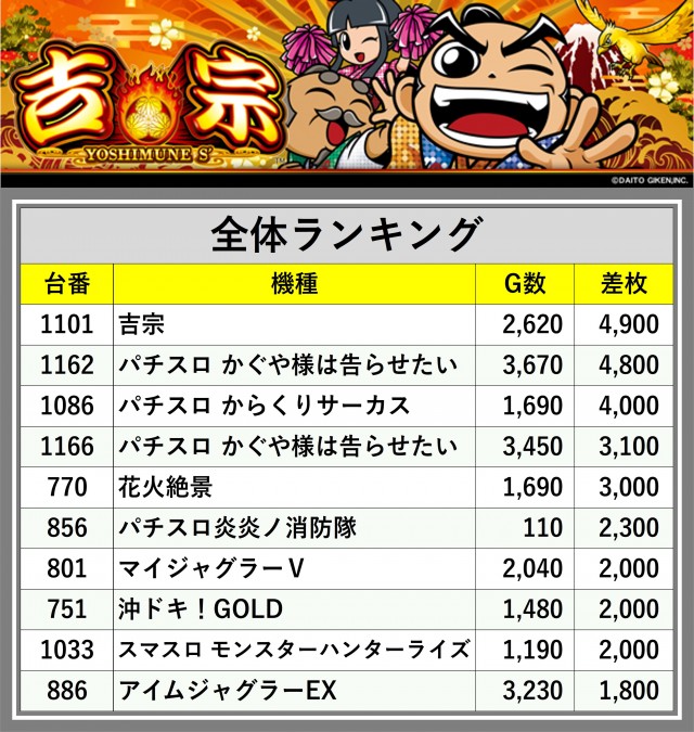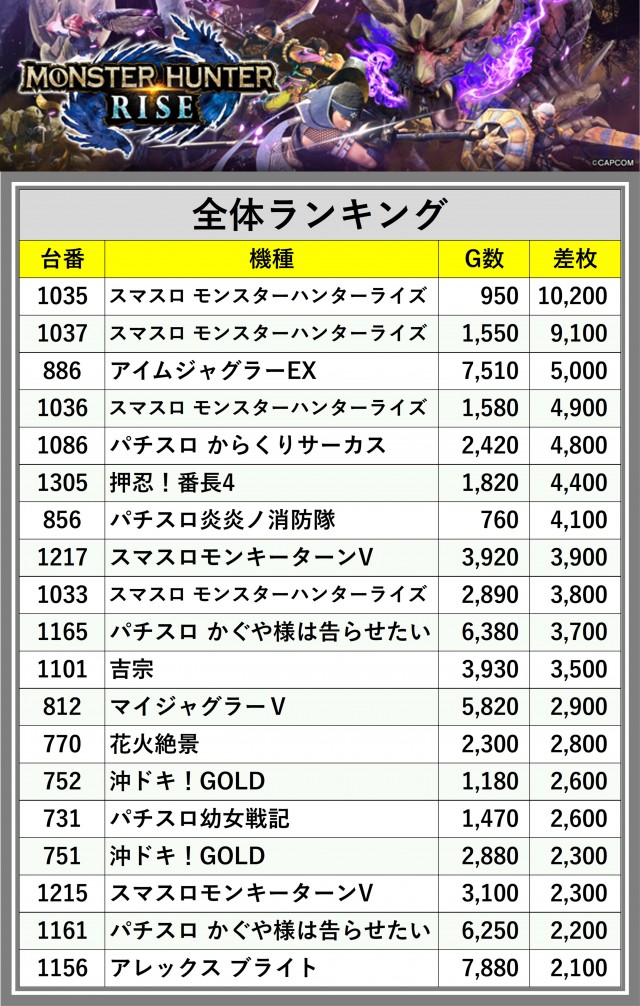 厳選された取材対象機種をはじめ、その他スロット全体から好記録が飛び出した!プレイヤーが楽しんだ1日を下記データにて振り返ってみて欲しい。