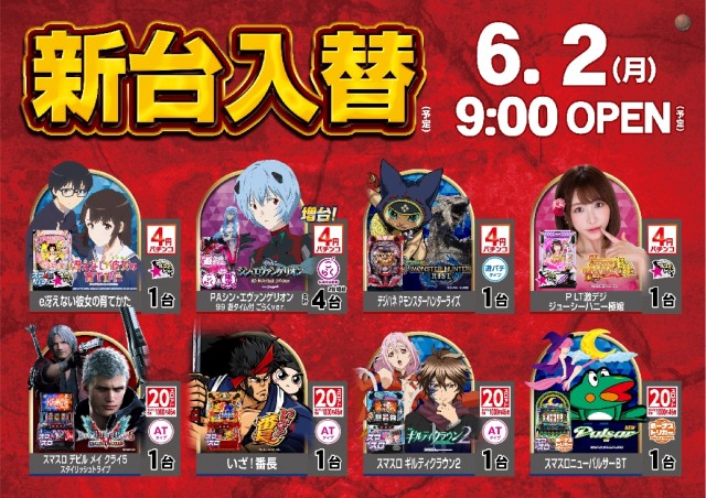 本日6月2日(月)新台入替(予定)