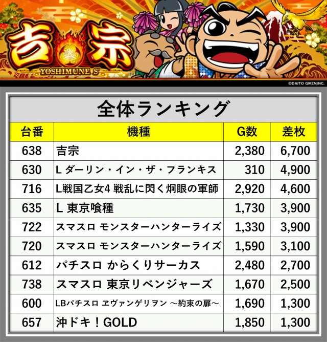 厳選された取材対象機種をはじめ、その他スロット全体から好記録が飛び出した!プレイヤーが楽しんだ1日を下記データにて振り返ってみて欲しい。