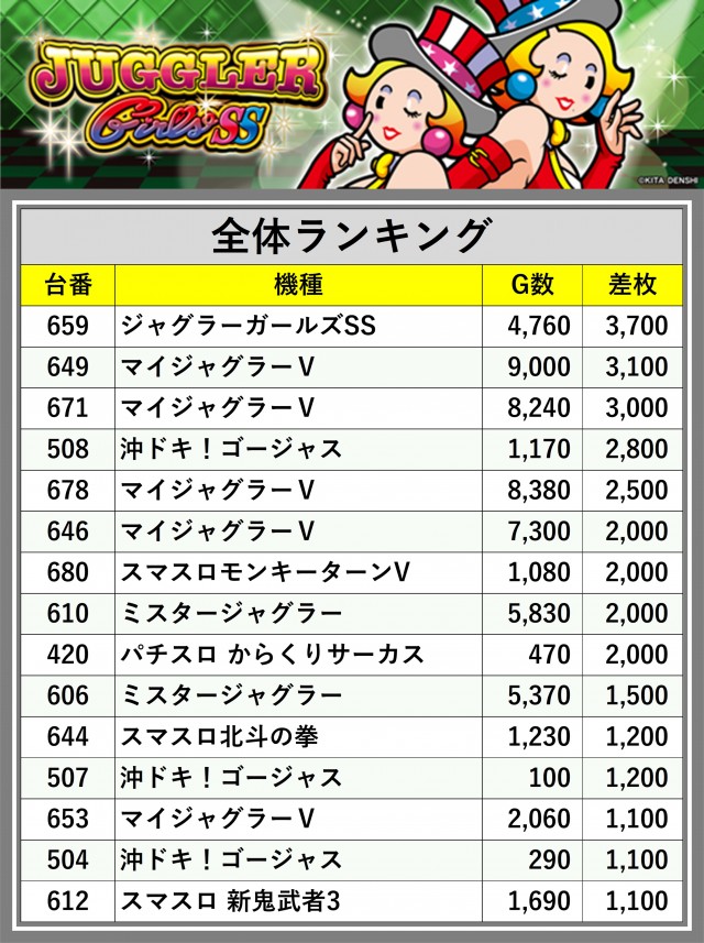 厳選された取材対象機種をはじめ、その他スロット全体から好記録が飛び出した!プレイヤーが楽しんだ1日を下記データにて振り返ってみて欲しい。