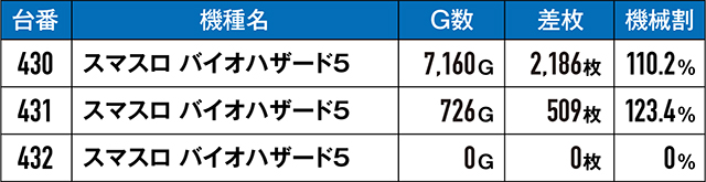 『スマスロ バイオハザード5』コーナーでの3台並びは、2台がプラス、1台が終日回されずという結果に。しかし2台がしっかりプラっているところを見るに、432番台も座られていたらプラっていた公算が大だ。