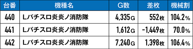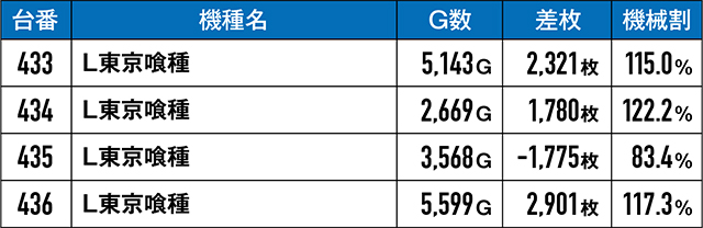 『L東京喰種』シマでは4台並びで好結果が出現していた。435番台がマイナスになってしまったものの、残る3台はいずれも1,500枚を上回っており、好調ぶりがうかがえる内容に。