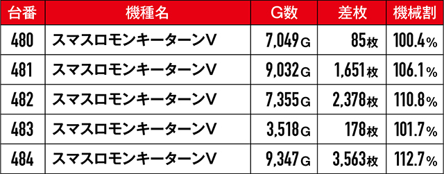 なんと全台プラスを達成してのけたのは『スマスロモンキーターンV』。3,000枚オーバー記録は1台に留まったものの、いずれの台も挙動は良好だったようだ。