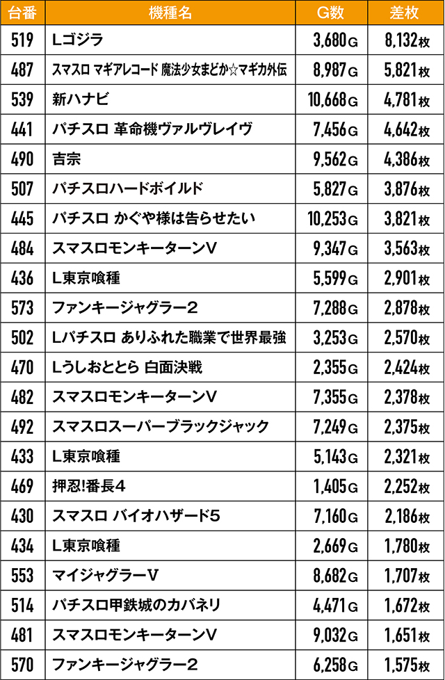 さまざまな機種からプラス差枚が生まれていたこの日。『Lゴジラ』や『スマスロ マギアレコード 魔法少女まどか☆マギカ外伝』などの新しめの機種から5,000枚オーバー台が誕生した反面、『新ハナビ』や『パチスロ 革命機ヴァルヴレイヴ』などのおなじみの機種からも4,000枚超え記録が誕生していた。