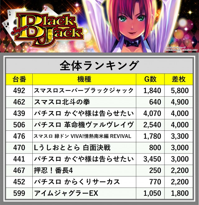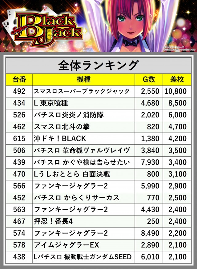 厳選された取材対象機種をはじめ、その他スロット全体から好記録が飛び出した!プレイヤーが楽しんだ1日を下記データにて振り返ってみて欲しい。