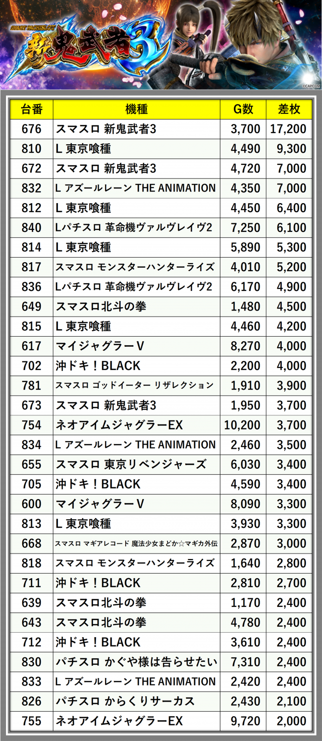 ※差枚数順に掲載しています