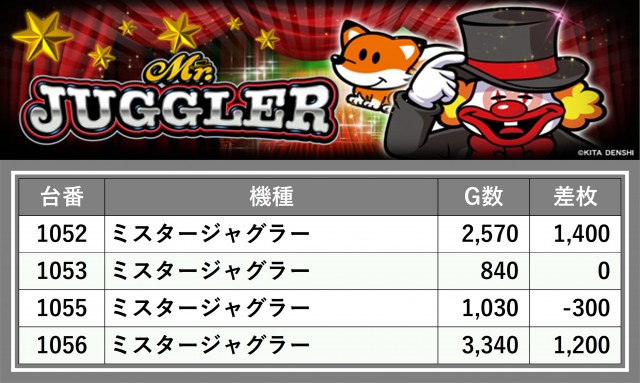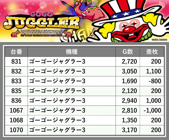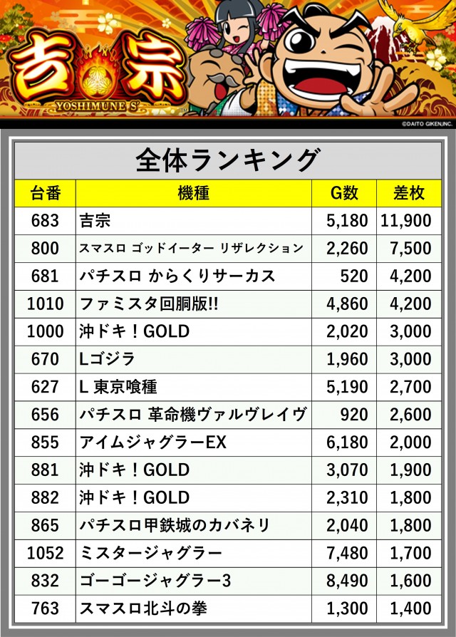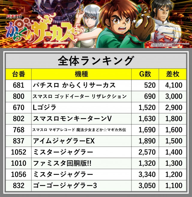 厳選された取材対象機種をはじめ、その他スロット全体から好記録が飛び出した!プレイヤーが楽しんだ1日を下記データにて振り返ってみて欲しい。