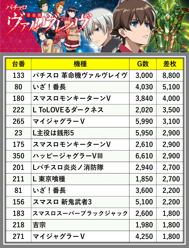 厳選された取材対象機種をはじめ、その他スロット全体から好記録が飛び出した!プレイヤーが楽しんだ1日を下記データにて振り返ってみて欲しい。