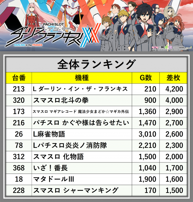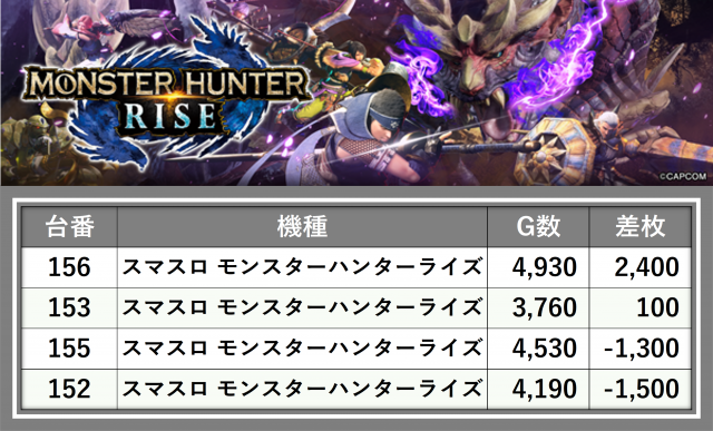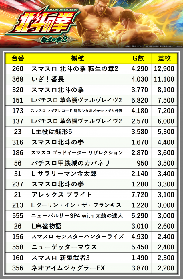 厳選された取材対象機種をはじめ、その他スロット全体から好記録が飛び出した!プレイヤーが楽しんだ1日を下記データにて振り返ってみて欲しい。