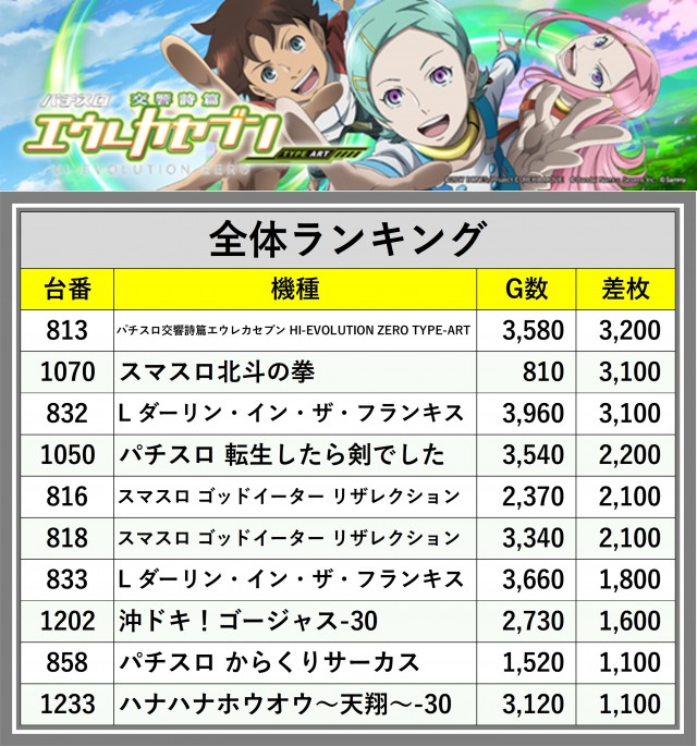 厳選された取材対象機種をはじめ、その他スロット全体から好記録が飛び出した!プレイヤーが楽しんだ1日を下記データにて振り返ってみて欲しい。