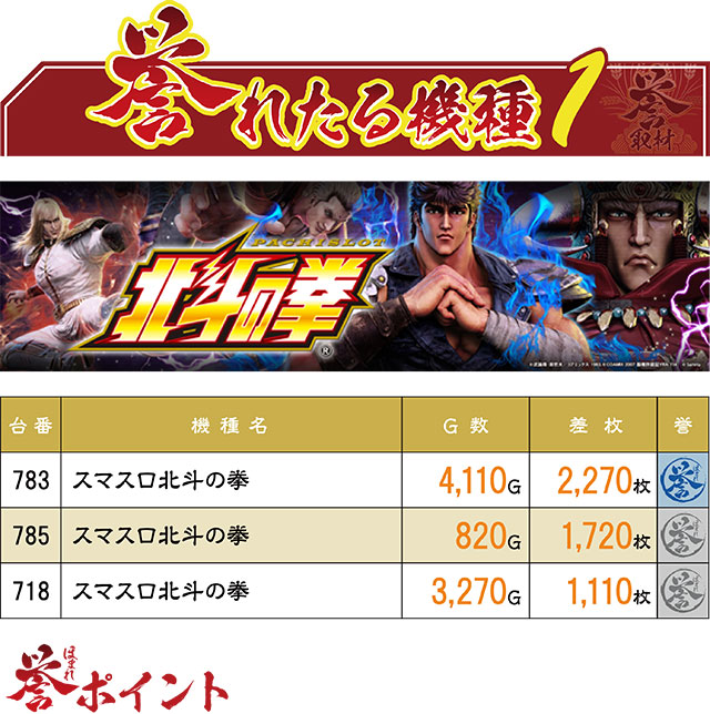 前回はおとなしかった『スマスロ北斗の拳』だが、この日は誉マーキングが2台!特に良挙動を見せていた783番台は、もっと回されることで赤誉マークに化けた可能性は十分!