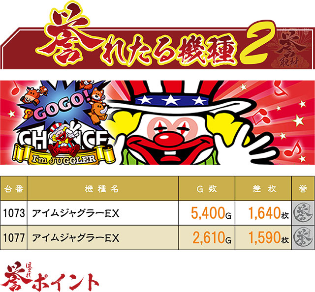 同じく2台の誉マークが飛び出したのは『アイムジャグラーEX』。その2台とも2,000枚を上回ることはなかったが、その挙動は決して悪いものではなかったようだ。