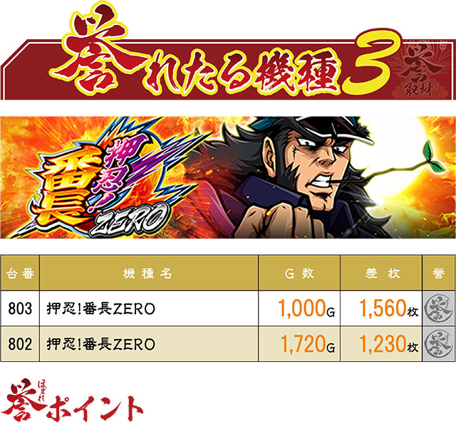 5台設置の『押忍!番長ZERO』からも2台の誉マークが出現。しかし他の機種と同様に総ゲーム数不足がたたり、差枚記録は伸び悩んでいた様子…。