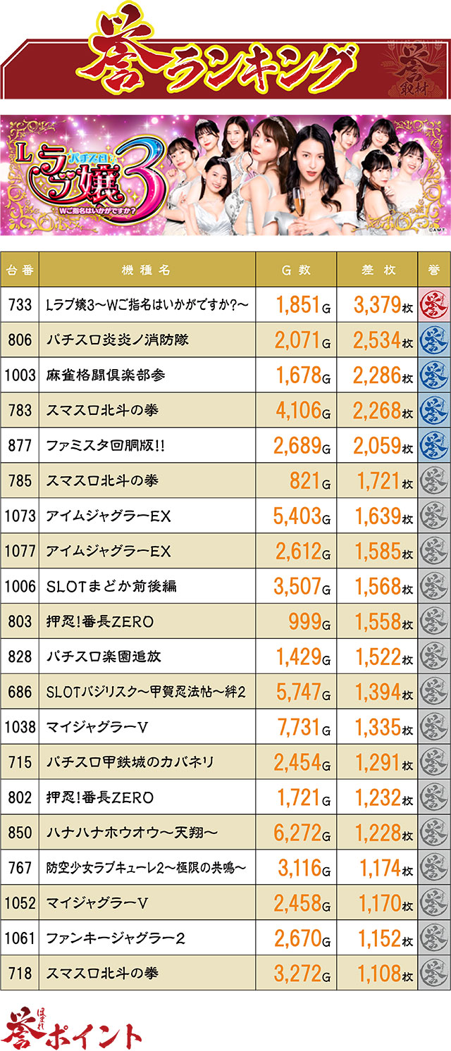 前回(8/13)の誉取材では、赤誉マーキングが生まれなかったが、今回は『Lラブ嬢3~Wご指名はいかがですか?~』が3,000枚を突破し、前回のリベンジを果たすことに成功した。とは言え、赤誉マークが1台に留まったのは、全体的な総ゲーム数不足によるものだろう。もっと回されていたら…!