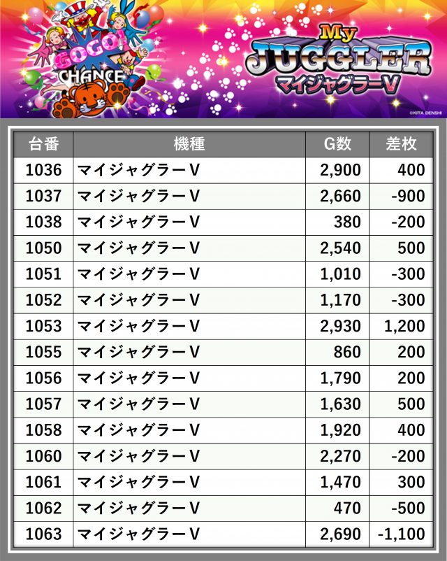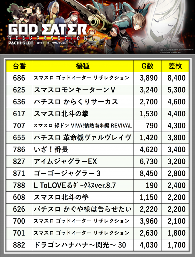 厳選された取材対象機種をはじめ、その他スロット全体から好記録が飛び出した!プレイヤーが楽しんだ1日を下記データにて振り返ってみて欲しい。