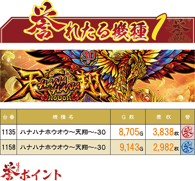 毎回3,000枚オーバー記録を生み出し、誉ランキングに名を刻むのが『ハナハナホウオウ~天翔~-30』。今回も例外ではなかったようで、1135番台が3,000枚を優に超える結果でランクイン。また1158番台は惜しくも3,000枚に届かず…!