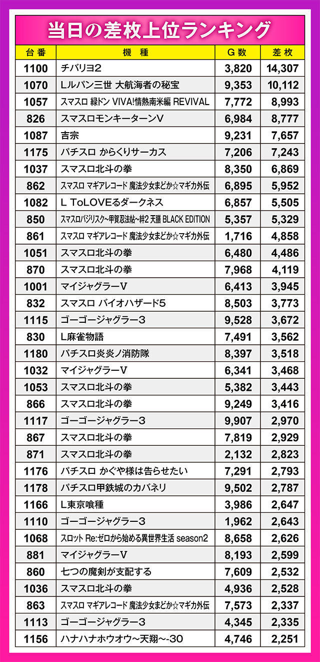 『チバリヨ2』と『Lルパン三世 大航海者の秘宝』から10,000枚オーバーが生まれ、この日の1・2位を独占する波乱の結果に。3位以下にはおなじみの面々が並んではいるものの、この結果に驚いた常連スロッターも多かったはず。思えば前回もバラエティー機種が1位となっていたような…。