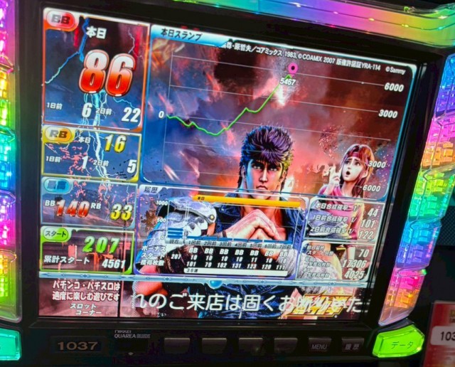 マイナス台はたったの4台のみ。プラス台で溢れていた『スマスロ北斗の拳』コーナーは大きな盛り上がりを見せていた。最終的に半数の台が2,000枚オーバー!