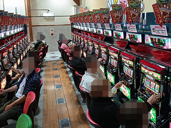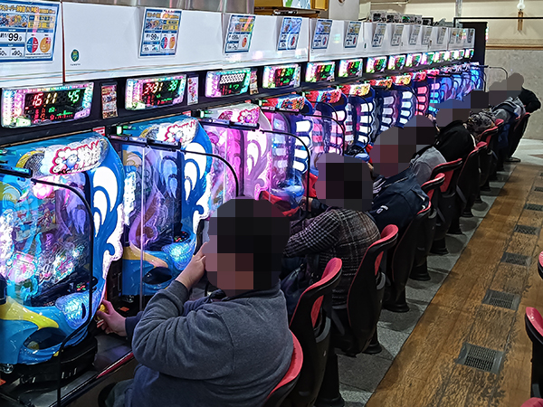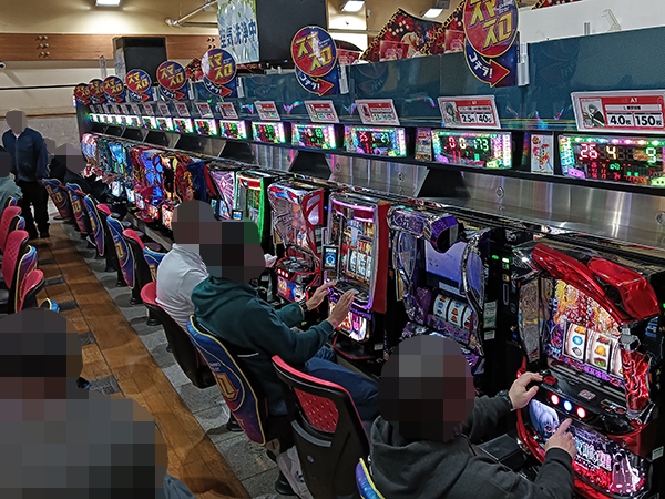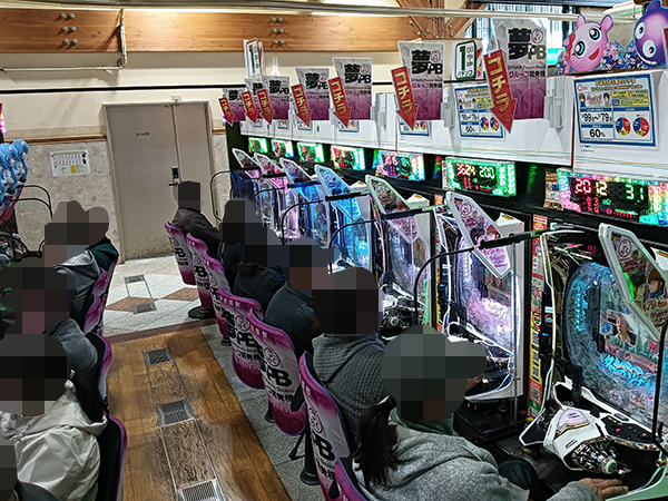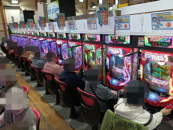 取材時は既に多くのプレイヤーが集結し、パチンコ・パチスロを問わずにぎやかな状況となっていた。