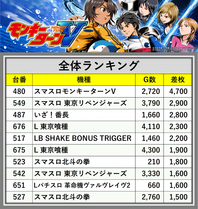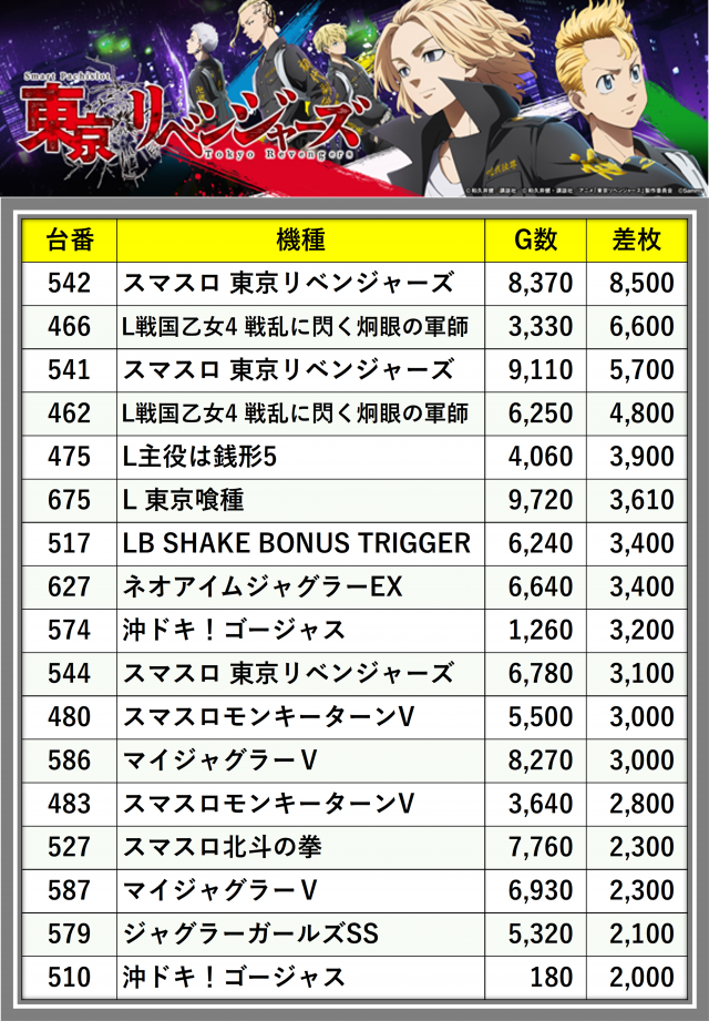 ※差枚数順に掲載しています