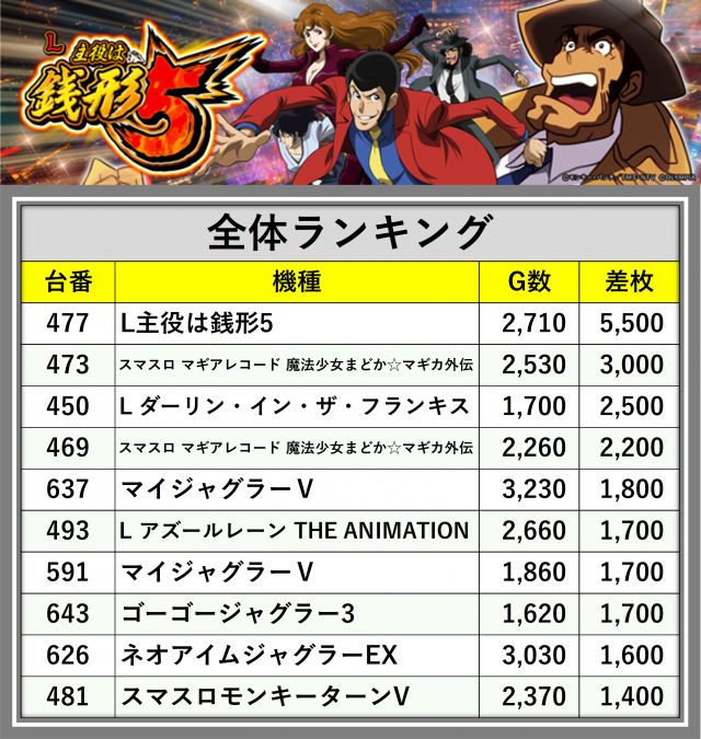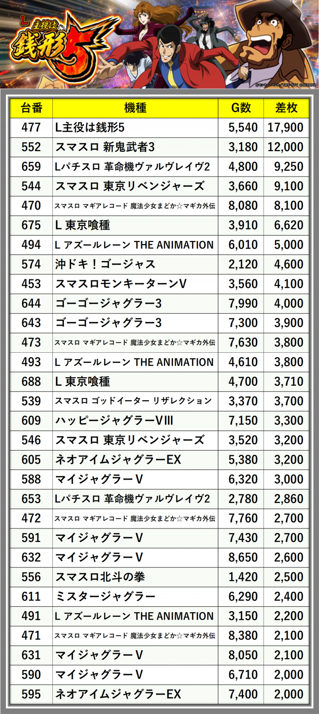 厳選された取材対象機種をはじめ、その他スロット全体から好記録が飛び出した!プレイヤーが楽しんだ1日を下記データにて振り返ってみて欲しい。
