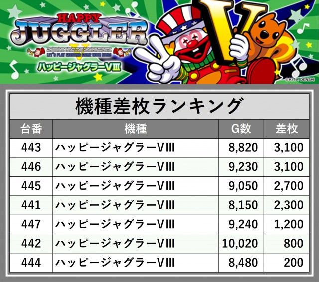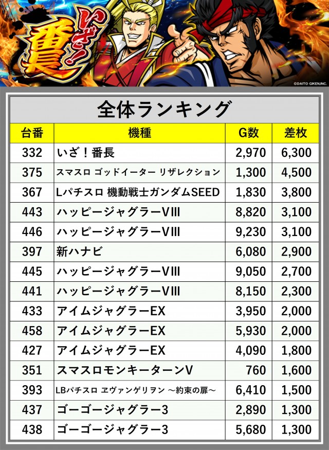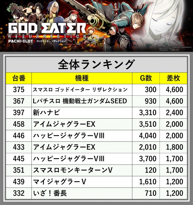 厳選された取材対象機種をはじめ、その他スロット全体から好記録が飛び出した!プレイヤーが楽しんだ1日を下記データにて振り返ってみて欲しい。
