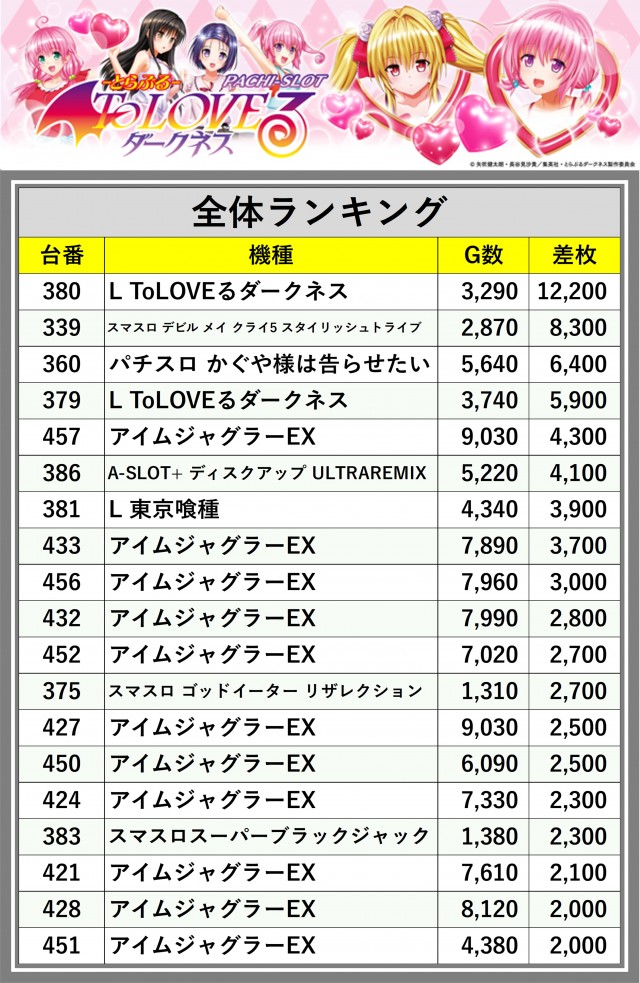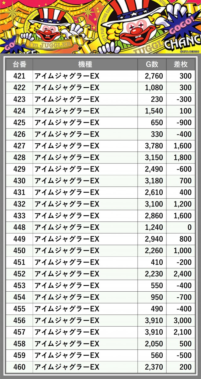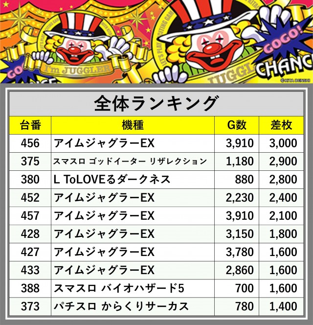 厳選された取材対象機種をはじめ、その他スロット全体から好記録が飛び出した!プレイヤーが楽しんだ1日を下記データにて振り返ってみて欲しい。