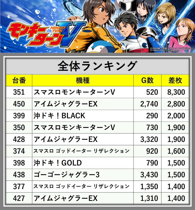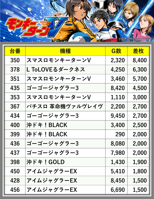 ※差枚数順に掲載しています